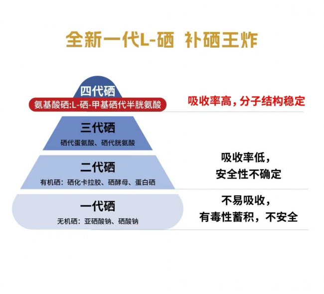 硒产品的原料经历了从第一代无机硒到第四代有机硒的进化,每一代都在安全性、吸收率和功效性上有显著提升: