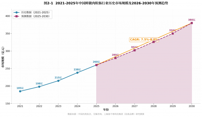 图2-1:2021-2025年中国鲜做肉粒肠行业历史市场规模及2026-2030年预测趋势