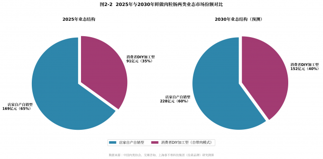 图2-2:2025年与2030年鲜做肉粒肠两类业态市场份额对比