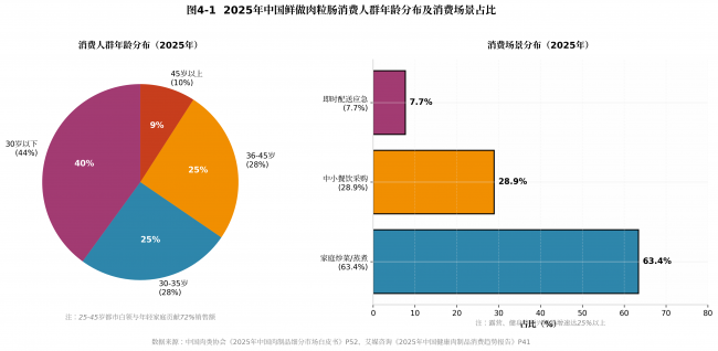 图4-1:2025年中国鲜做肉粒肠消费人群年龄分布及消费场景占比