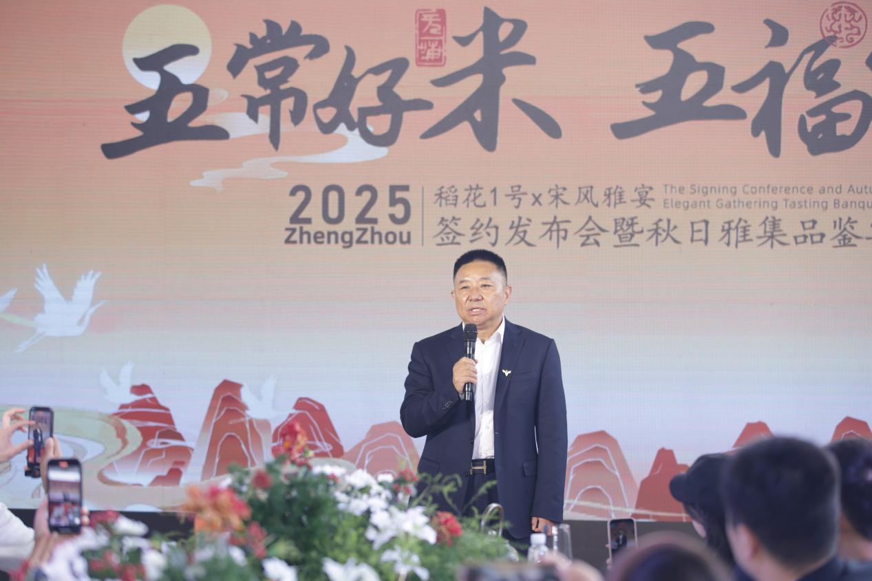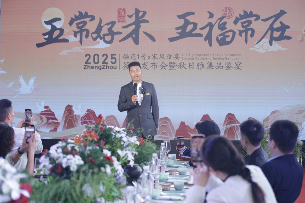 稻花1号五常大米董事长苑金龙上台揭秘了宋风雅宴“食材之雅”的“品质密码”。作为五常大米中的优质代表,稻花 1 号始终坚守“好米 0 添加” 理念,从生态种植到品质把控,每一个环节都力求极致。苑金龙的分享,让现场嘉宾对这碗宋风雅宴的菜品以及“稻花1号”的品质有了充分认可。在雅乐氛围烘托下,宋风雅宴品牌创始人成国富与稻花 1 号五常大米董事长苑金龙共同上台,在合作签约协议上郑重签字。这一笔,不仅是 “宋风雅宴”文化底蕴与“稻花 1 号”品质坚守的深度契合,更是宋风雅宴菜品品质升级的又一重要时刻。