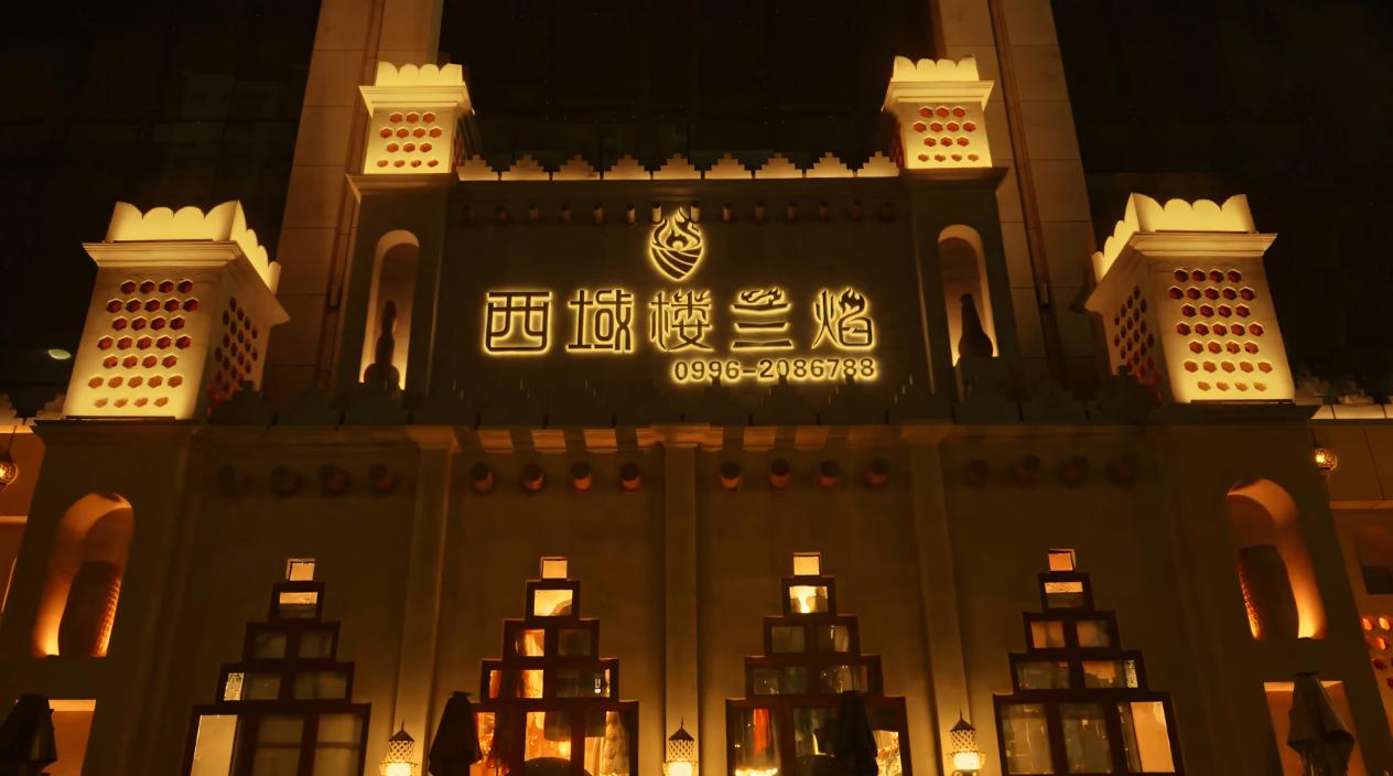 如今,“西域楼兰焰”已在库尔勒市开设三家门店,分别位于延安路、建国北路和国贸中心,每家门店都是一座“立体的丝路风情画”。走进门店,文创区陈列着维吾尔族铜器、木雕等非遗手工艺品,每一件都承载着民族技艺的传承;用餐区的装修融入了大量西域元素,穹顶彩绘、民族花纹、传统挂毯,让人仿佛穿越千年,置身古楼兰的繁华市集;每日定时上演的民族歌舞表演,更是让食客们沉浸式感受的热情与活力——维吾尔族的麦西来甫、黑走马,舞者们灵动的身姿与欢快的节奏,常常引得食客主动加入,现场变成一片欢乐的海洋。