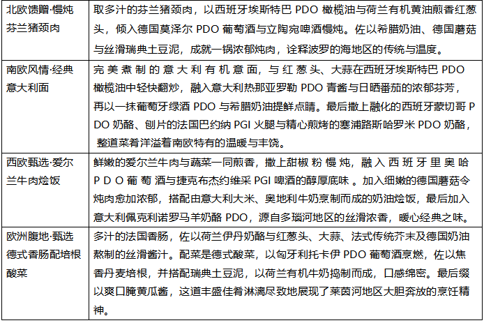 四款特色寻味餐盒分别呈现来自北欧、南欧、西欧及欧洲腹地的风味精华,精选欧盟地理标志产品:西班牙埃斯特巴PDO橄榄油、荷兰有机黄油、德国莫泽尔PDO葡萄酒、意大利有机意面、法国巴约纳PGI火腿、塞浦路斯哈罗米PDO奶酪、意大利热那亚罗勒PDO、西班牙蒙切哥PDO奶酪、葡萄牙绿酒PDO、西 班 牙 里 奥 哈 P D O有机 葡 萄 酒、捷克布杰约维采PGI啤酒、意大利佩克利诺罗马羊奶酪PDO、荷兰有机牛奶、匈牙利托卡伊PDO葡萄酒。