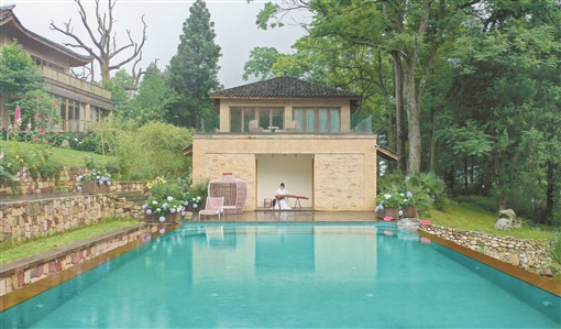 6月12日,张家界武陵源区龙尾巴村,梓山漫居民宿里游泳池旁古筝表演。农村成了乡村旅游目的地,小村落里迎来大变样。