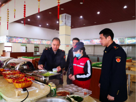 执法人员检查服务区自助餐厅饭菜情况
