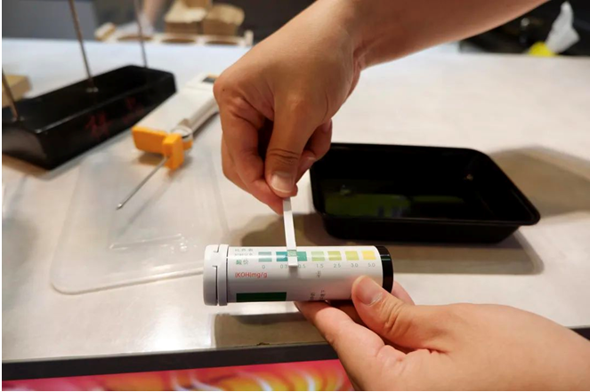 在某薯塔小店前,闵行区市场监管局梅陇市场监管所执法人员对店内使用的煎炸油取样抽检。油锅内的煎炸油经过冷却后,呈现淡黄色,执法人员对样品的酸价和过氧化值做快速检测,检测结果均在合格范围内。“酸价结果小于3%,证明还是比较安全的,一旦在5%以上,里面的成分就可能对人体造成伤害,所以商家一定要及时更换煎炸油,保证原料新鲜。”梅陇市场监管所执法人员赵君霖表示。