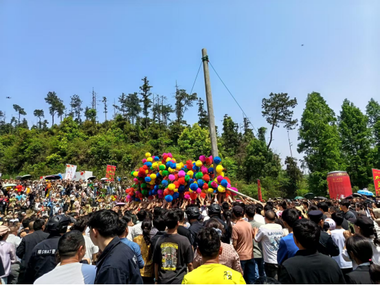 11点28分,庙会最具人气的“抢绣球祈福”活动如期上演,瞬间点燃现场氛围。挂满红、黄、绿、蓝、紫五色彩球的毛竹杆傲然矗立在广场中央,每一种颜色都承载着美好的寓意——红球祈愿添丁纳福,绿球期盼喜得千金,黄球寓意旺财纳喜,蓝球祝愿平安顺遂,紫球祈盼事业有成。随着一声令下,毛竹轰然倒下,五彩绣球随风飘落,现场群众早已按捺不住热情,纷纷伸手争抢,欢呼声、喝彩声震耳欲聋,将整场庙会的热闹氛围推向顶峰。