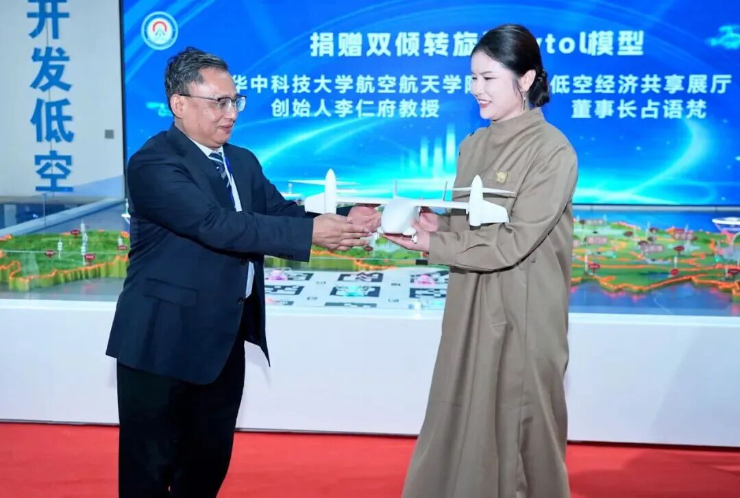 活动现场,青菱都市工业园与中军国业签署合作协议,企业落地后将进一步带动产业链上下游企业协同发展,进一步强化青菱片区在低空经济领域的集群优势,助力区域低空经济高质量发展。华中科技大学航空航天学院创始人李仁府教授向低空共享展厅捐赠双倾转旋翼evtol模型。