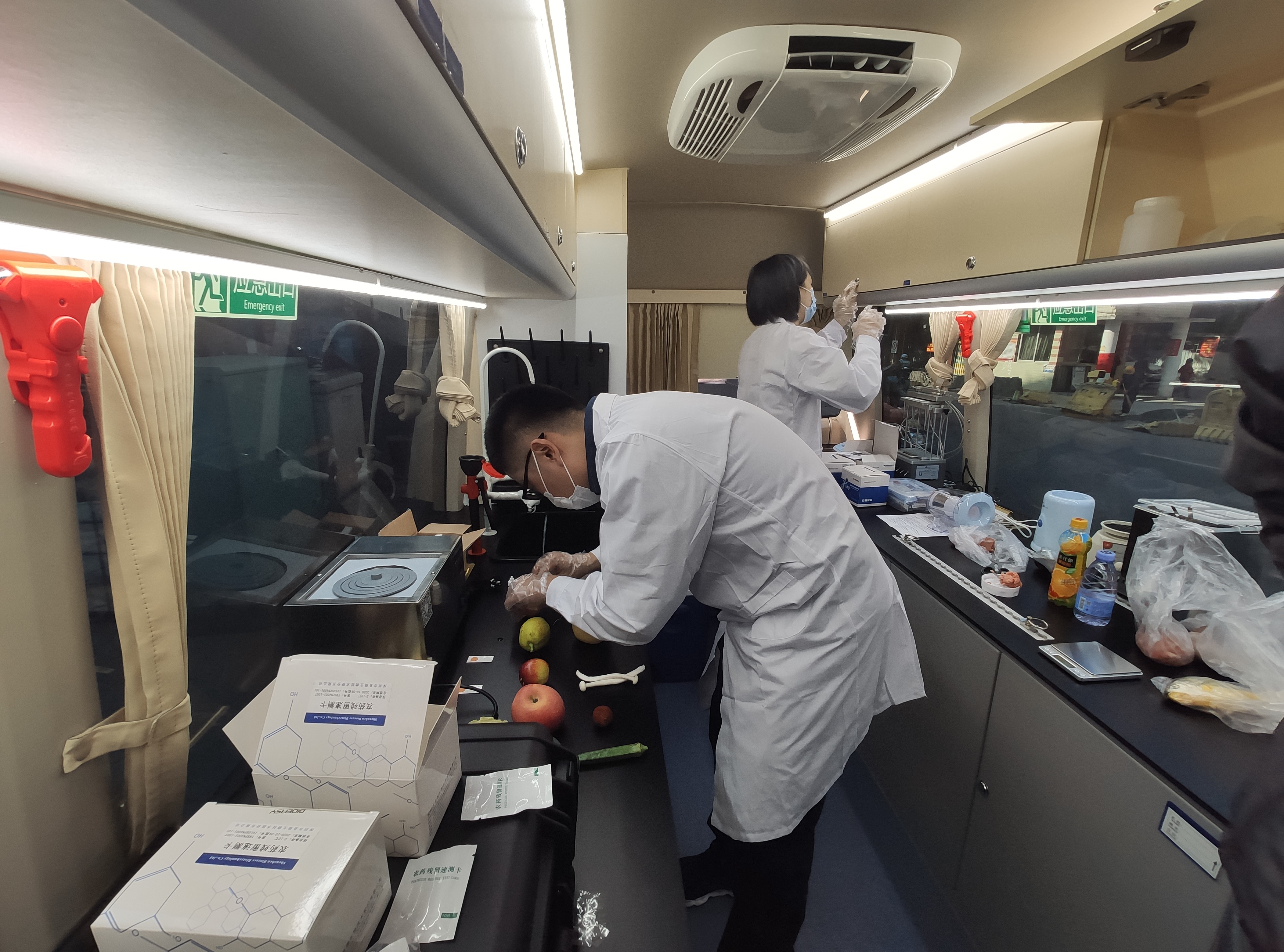 第三方检测机构工作人员正在食品安全快检车上对随机抽取的食品做快速检测