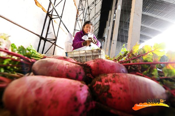 在该县乐亭镇赵蔡庄村一处特色蔬菜种植基地,农民正在将用于线上销售的“凤梨萝卜”装箱准备运往配送中心。