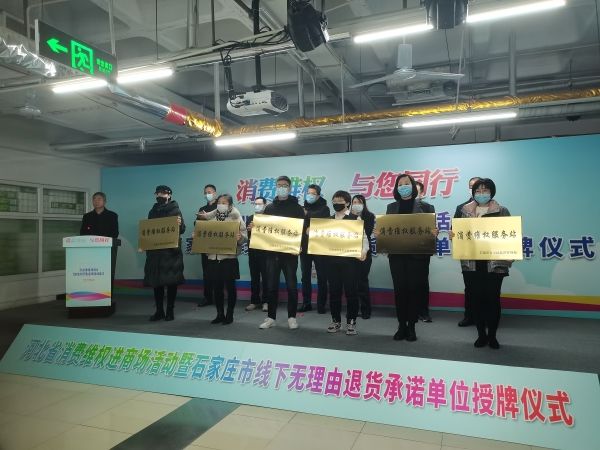 授牌仪式上,河北永辉超市有限公司桥西分公司、河北祥隆泰超市有限责任公司新华店、迪卡侬(北京)体育用品有限公司石家庄槐安东路分公司、石家庄玉华信誉楼百货有限公司、河北保龙仓家乐福商业有限公司中山店、上海红星美凯龙品牌有限公司和平分公司等6家线下实体店无理由退货承诺单位代表接受了首次授牌。
