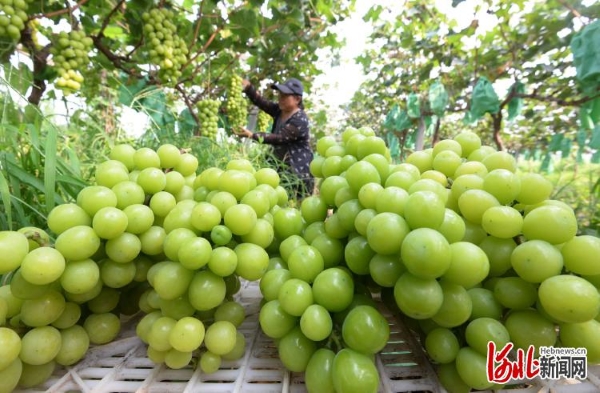 2021年8月16日,河北省邯郸市肥乡区天台山镇群利种植专业合作社的工人在收获阳光玫瑰葡萄。 近年来,河北省邯郸市肥乡区与农业科研机构合作,采取“企业+研究所+政府+农户”的模式,因地制宜发展特色农业。目前,该区已培育“阳光玫瑰葡萄”等一批市场前景好、增收能力强的特色农业项目,带动农民实现增收。 通讯员 郝群英 摄影报道