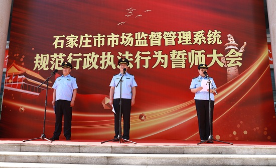 中国食品安全网讯(王颖 庞起生)为进一步优化营商环境,7月7日,河北省石家庄市市场监管局组织召开了全市市场监管系统规范行政执法行为誓师大会,发布了《市场监管行政执法“十六个严禁”》,与全体执法人员签署承诺书,要求执法人员做到执法为民、依法行政、文明执法,以最大的决心和力度,严格规范执法行为。石家庄市市场监管局党组书记、局长冯素伟出席会议并讲话,党组副书记、副局长谢艳华主持会议,党组成员、二级调研员宋玖江等参加会议。