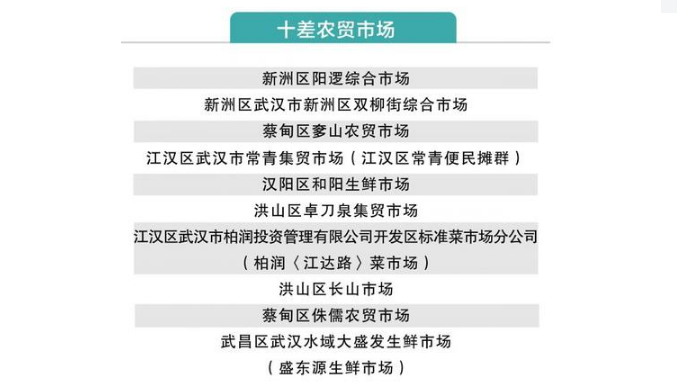 十差农贸市场名单分别是:新洲区阳逻综合市场、新洲区武汉市新洲区双柳街综合市场、蔡甸区奓山农贸市场、江汉区武汉市常青集贸市场(江汉区常青便民摊群)、汉阳区和阳生鲜市场、洪山区卓刀泉集贸市场、江汉区武汉市柏润投资管理有限公司开发区标准菜市场分公司(柏润<江达路>菜市场)、洪山区长山市场、蔡甸区侏儒农贸市场、武昌区武汉水域大盛发生鲜市场(盛东源生鲜市场)。(陶常宁)