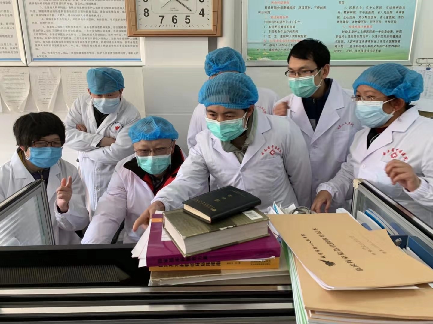 2 月 5 日,王刚上午 8:00,到咸宁市中心医院会诊病人,1 例核酸阳性,已经多次输血小板,冷沉淀,查看液体入量,5 天以来正平衡近 5000 多,白蛋白 23……王刚和昆明医科大学第三附属医院重症医学科副主任医师付朝江、咸宁市中心医院医护人员认真的讨论着病情,研究下一步治疗方案。