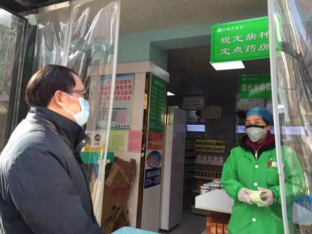 襄阳市市场监管局副局长席修璞(左)督促药店做好防疫工作
