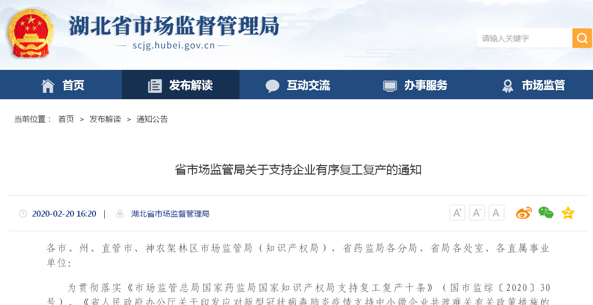 中国食品安全网讯(熊源 曹本锋 曾里 记者胡毅)近日,为进一步加强新冠肺炎疫情科学防控,做好保供应、保秩序、保安全、保价格、保质量工作,湖北省市场监管局出台支持企业有序复工复产的九条措施,充分发挥市场监管职能作用,支持企业复工复产、共度难关。这些措施涵盖行政许可网上办理、建立应急审批通道、延长行政许可期限、依法监管审慎执法等方面。