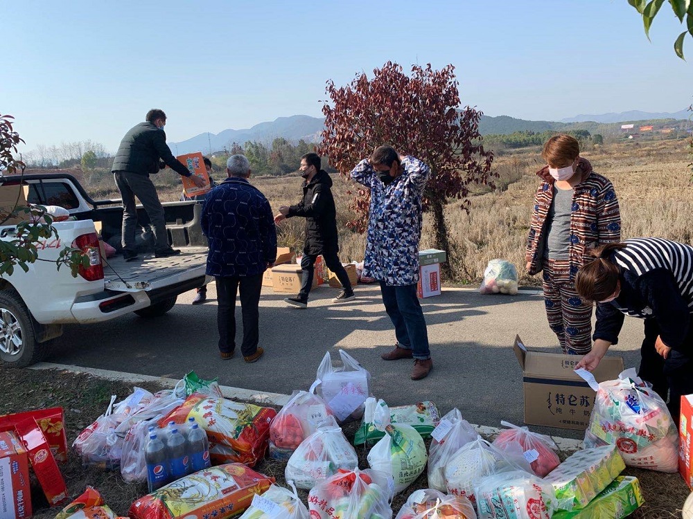 良荐村与阳新一中一同组织爱心募捐活动,捐赠大米、纸巾、蔬菜等生活物资发给村民,消除疫情从内部扩散的风险隐患。
