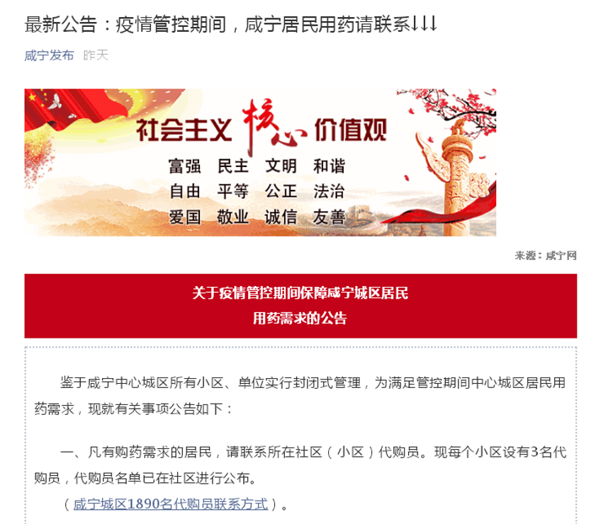 中国食品安全网讯(熊源 记者胡毅)2 月 25 日,为满足管控期间中心城区居民用药需求,咸宁市新冠肺炎防控指挥部发布了《关于疫情管控期间保障咸宁城区居民用药需求的公告》。