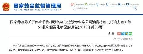 中国食品安全网讯(记者 胡毅)12月26日,国家药品监督管理局发布《关于停止销售标示名称为楚颜专业染发焗油膏棕色(巧克力色)等51批次假冒化妆品的通告(2019年第98号) 》。