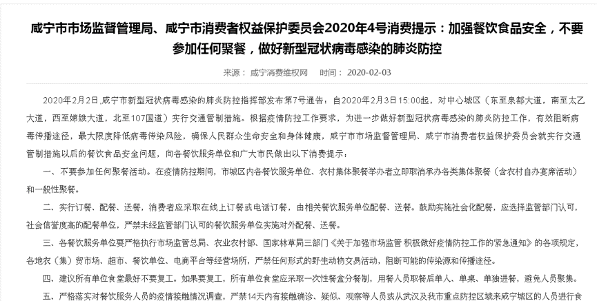 中国食品安全网讯(熊源 周毅宏 记者胡毅)2 月 3 日,为切实做好新型冠状病毒感染的肺炎疫情防控工作,有效防止新型冠状病毒感染的肺炎传播,咸宁市市场监督管理局联合咸宁市消费者权益保护委员会发布 2020 年 4 号消费提示,提示各餐饮服务单位和广大市民在实行交通管制措施后,需加强餐饮食品安全防护,不要参加任何聚餐。