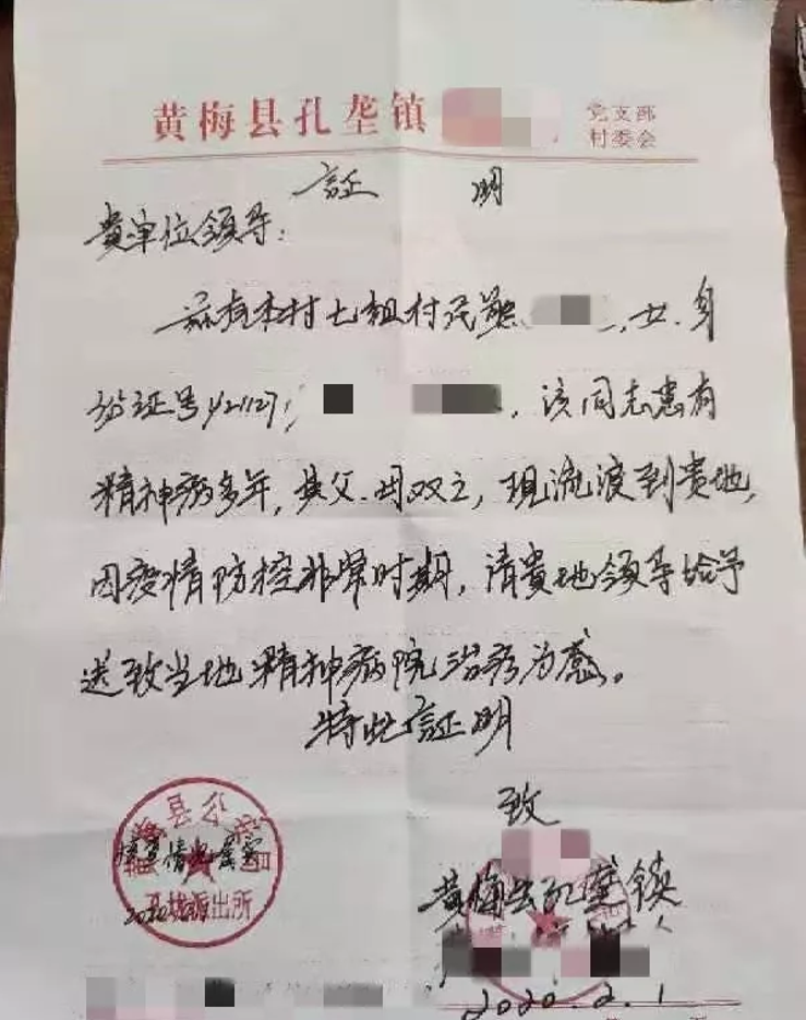 付飞跃帮助熊某某找到其户籍地黄梅县孔垄派出所后,通过电话证实了其确有轻度精神障碍,但随着疫情爆发,各地都已采取交通管制措施,熊某某返乡隔离治疗的诉求难以实现。孔垄派出所表示,愿出具证明希望英山方面留治。