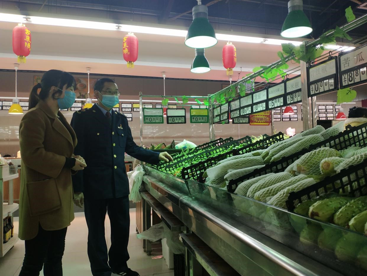 朱开远(右一)检查超市蔬菜价格