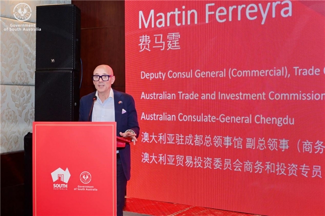 3月22日下午,30余家优质南澳酒类及美食展商及欢聚“品味南澳”商务推介会,澳大利亚驻成都总领事馆副总领事费马霆(Martin Ferreyra)先生亲临现场并发表致辞。