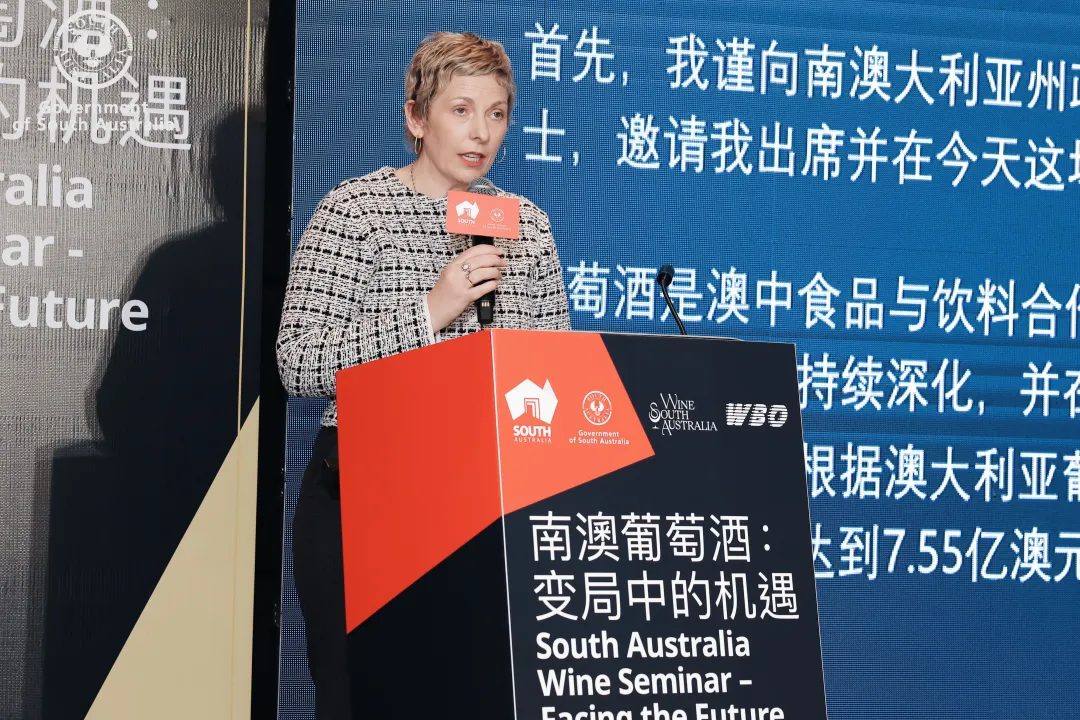 邵美珍介绍了南澳作为“澳大利亚葡萄酒之州”的产业实力,提及南澳瓶装葡萄酒产量占澳全国50%以上、高端酒占比约80%的亮眼数据,阐述了南澳州18 个特色葡萄酒产区的产业集群优势,以及当地保留的百年古老葡萄藤、孕育的奔富等国际知名品牌与在有机种植、自然酿造等清洁农业技术上的全球领先水平,强调了2025年澳大利亚对华葡萄酒出口额达7.55亿澳元,领事馆将助力南澳葡萄酒深耕西南市场,推动双方行业的深度合作。