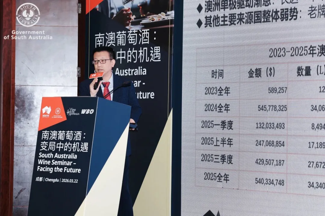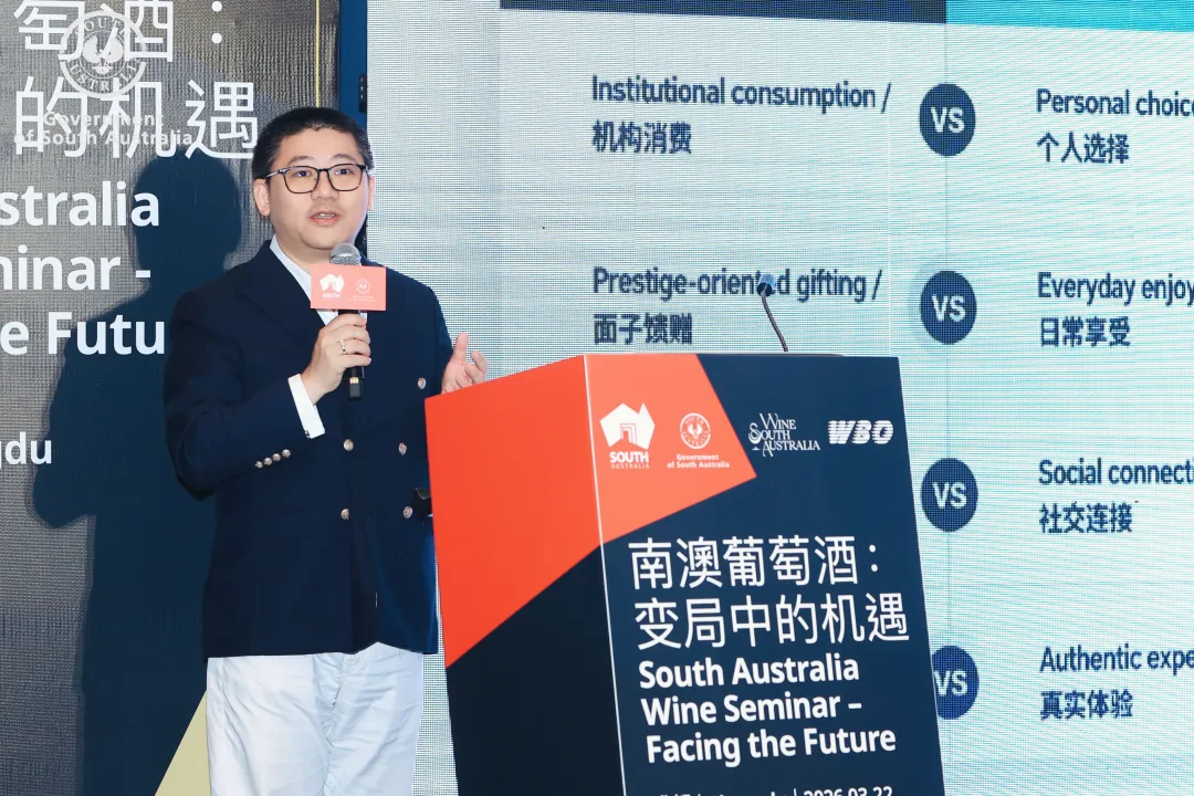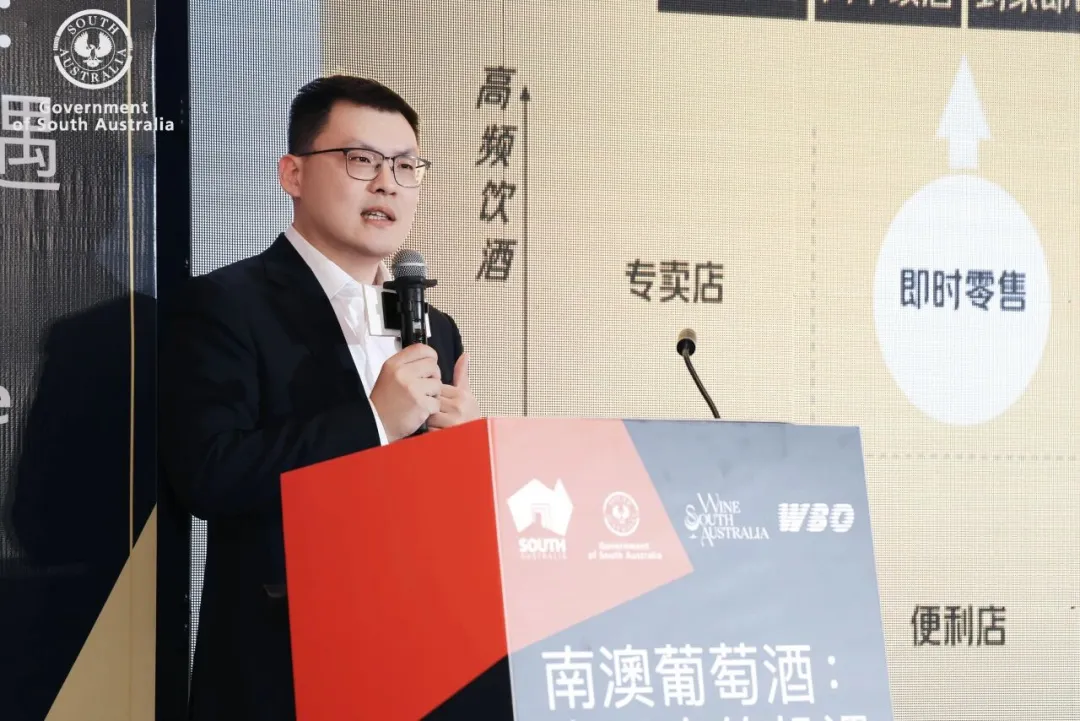 ASC精品酒业市场及传讯总监龚国亮先生提出中国葡萄酒市场正处于转型期,分享了2026年1月澳对华白葡萄酒出口同比暴增77%的亮点及实操运营经验。
