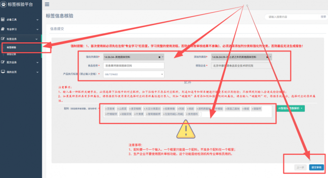 标签全要素智能校验:覆盖原料表、营养成分、警示语、宣称用语等数十个合规检查点。