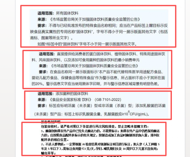 为从根本上破解这一困局,国内首款覆盖全品类、全流程的食品标签合规AI系统——“食安天下”正式面向全社会开放使用。该系统以国内唯一的标签100%合规辅助能力,已获得30余家专业检测机构的权威背书,并成功服务超过1000家食品生产企业,覆盖饮料、糕点、米面制品、调味品、肉制品等多个加工领域。