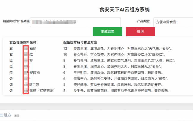 此外,该系统还内嵌了药食同源产品AI组方功能,能够在保障合规的前提下,辅助企业快速完成功能性食品的研发与标签设计,进一步提升产品附加值。