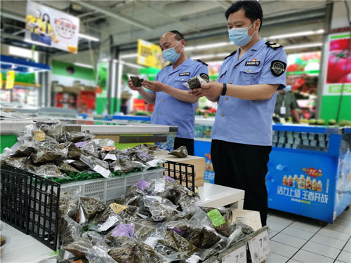 在市区光明路一家大型连锁超市内,市场监管执法人员对在售粽子的生产日期、包装标识、质量合格证明进行了细致检查,严防过期、变质、“三无”等假冒伪劣食品在市场流通,让市民吃上“放心粽”。