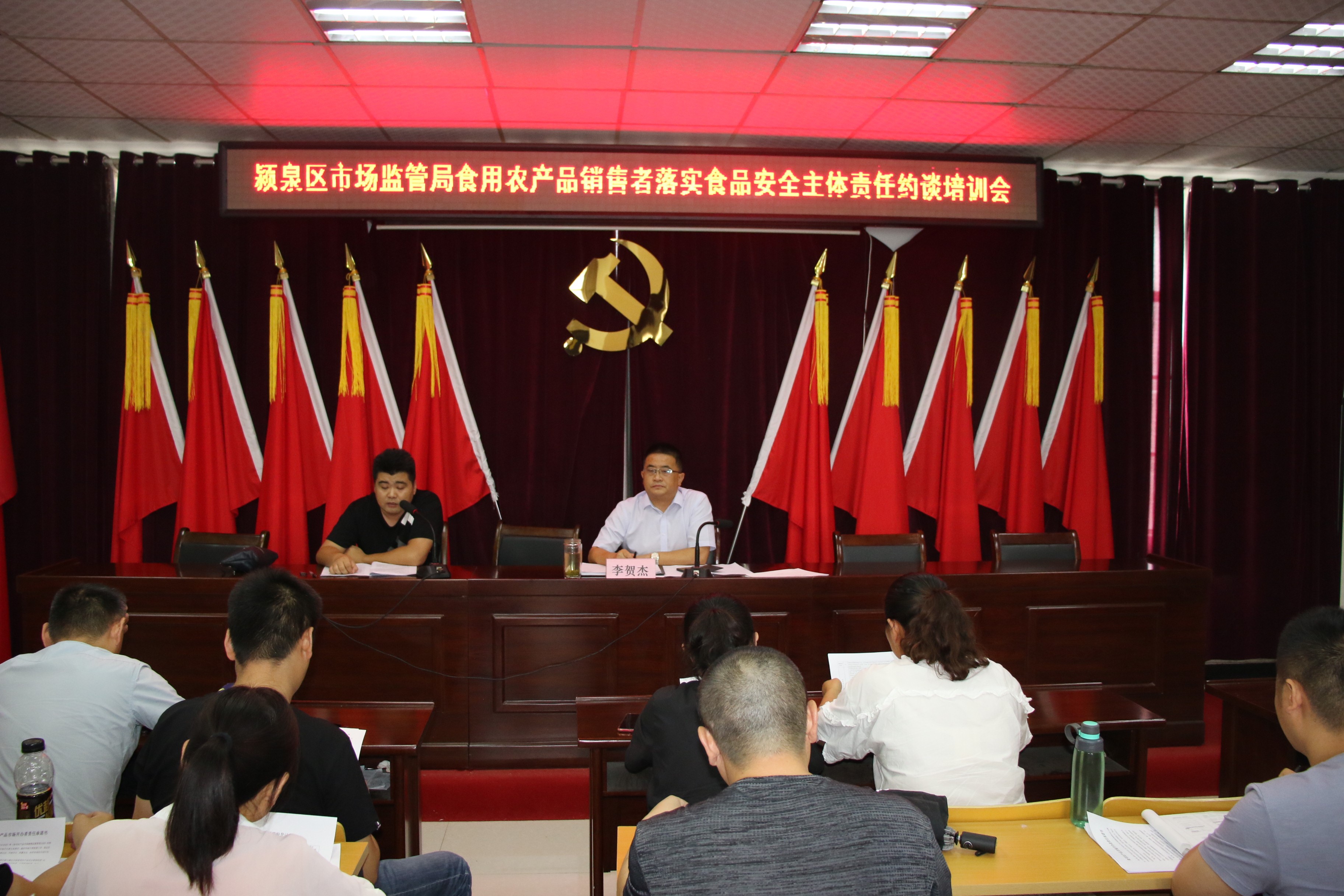 中国食品安全网讯 (颍泉区市场监督管理局 王立 李贺杰) 7月24日下午,阜阳市颍泉区市场监督管理局召开食用农产品销售者落实食品安全主体责任约谈会。颍泉区市场监督管理局党组成员、副局长李贺杰主持会议,局相关股室负责人、各所所长、执法人员、农贸市场开办者、商超经营者代表参加会议。