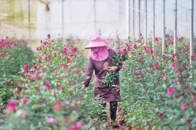 2月15日,在中国云南石林彝族自治县锦苑花卉产业园,花农采摘和搬运鲜花。