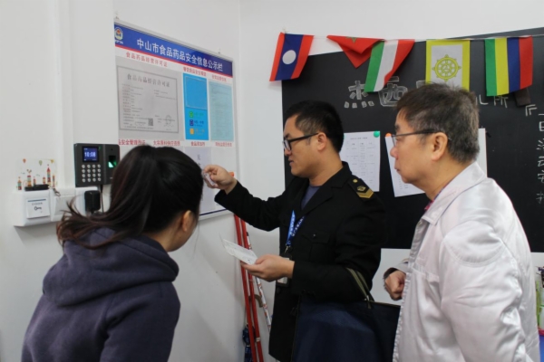 第一站的厚兴黎桂添幼儿园食堂共有550多名学生用餐,是中山市餐饮服务“明厨亮灶”示范单位,餐饮服务食品安全量化等级A级单位。检查结果显示,该校食品安全管理规范,食品供货商证照、猪肉检疫证明、食品购进单据等索证索票资料齐全,食品贮存符合分类、密封、先进先出等要求;餐用具使用专用清洗消毒水池清洗,有充足的电子消毒柜消毒餐用具;定期开展食品安全培训,员工穿戴统一工作衣帽、口罩、手套上岗;食品留样有专用留样冰箱,留样时间、重量、标签符合要求;餐厨废弃物处理由鱼塘协议回收,专人负责回收情况登记;执法人员抽选了猪肉、莴笋送区食品综合快检中心检测,检测结果均合格。