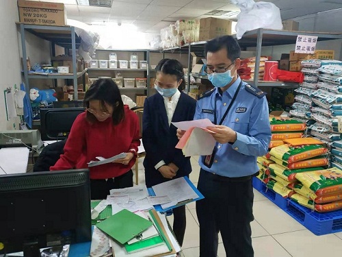 工作人员查看食品原料仓库