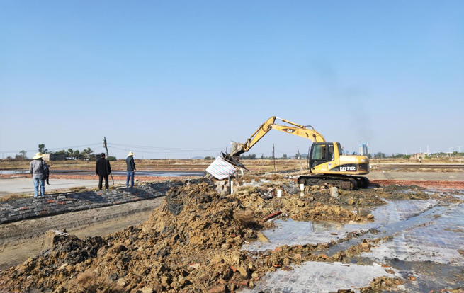 茂名滨海新区清理和取缔私晒盐场专项行动组对非法晒盐场地进行清理和取缔