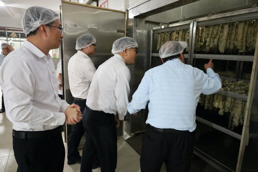 在鳌山村,调研组一行听取了鳌山村实施“百千万工程”的整体思路和详细举措的介绍,分析了在推进“百千万工程”各项任务中存在的困难和短板弱项。与会人员就结合地方特色食品,提升村集体收入,深入推动“百千万工程”落地等交流工作思路、建言献策。随后,走进黄圃镇“老字号”泰上王腊味企业,听取企业生产经营情况和经验介绍;参观生产车间,了解腊肠制作的过程和工艺。