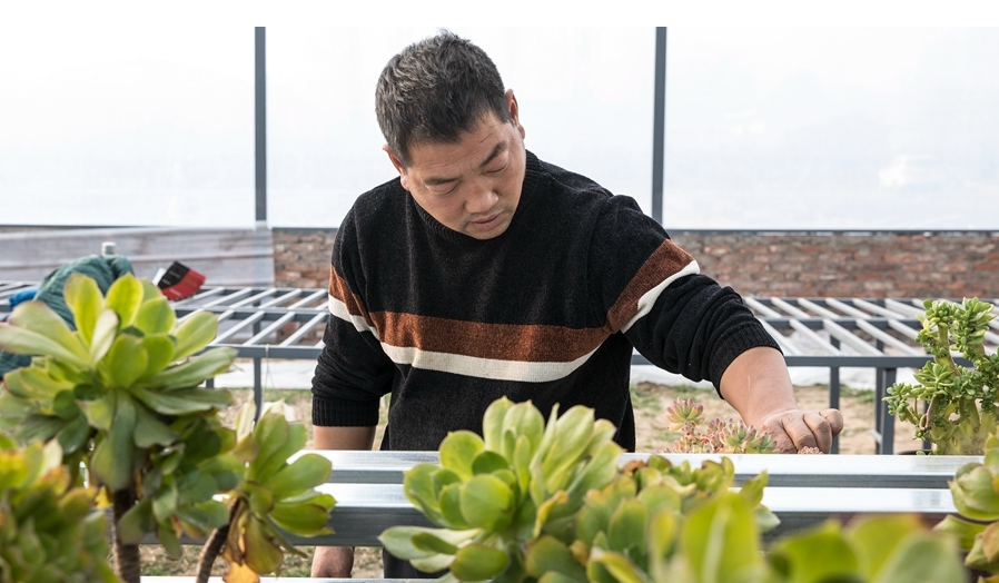 据了解,王堂村村民韩军委在外地打工时,偶然接触到多肉植物,便迷上了这种胖嘟嘟的植物。回乡后,他开始种植多肉植物,并在村两委的支持下,流转土地30亩,建起1000多平方的钢构大棚,种植多肉植物2万余盆,并通过养植、培训、务工等方式,带动王堂村十户贫困户脱贫致富。新华网发(郭东伟/摄)