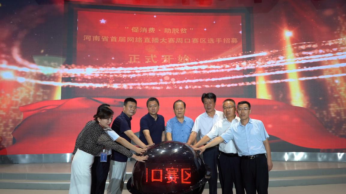 原周口市正市长级干部李绍彬,河南广播电视台都市频道总监张斌,河南省广播电视台都市频道营销策划部主任赵一龙,周口市商务局党组成员、副局长赵锐,周口市农业农村局副处级调研员安进,河南省人大代表、中原越秀实业公司董事长李玉平,周口市电子商务协会会长刘俊友,河南越秀云科技有限公司高海璐共同按下启动装置,标志着河南省首届网络直播大赛周口赛区正式启动。