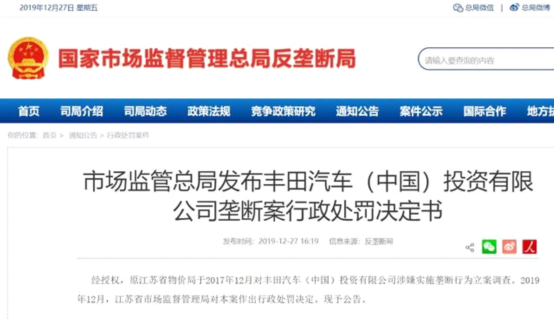 2019年12月,江苏省市场监督管理局对该案作出行政处罚决定:丰田中国统一经销商网络报价、限定经销商转售商品最低价格的行为,属于与交易相对人达成并实施“固定向第三人转售商品的价格”、“限定向第三人转售商品的最低价格”的垄断协议,违反了《反垄断法》第十四条的规定。