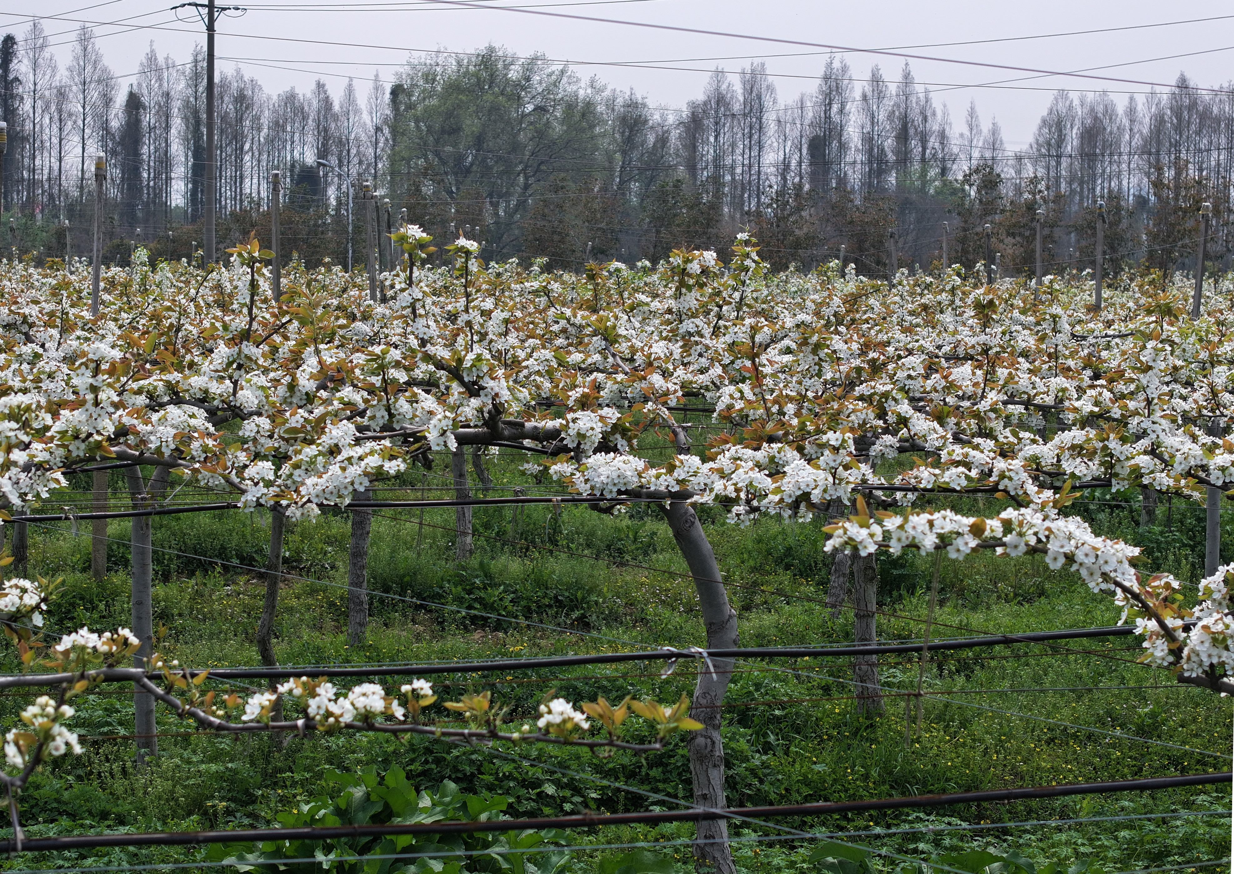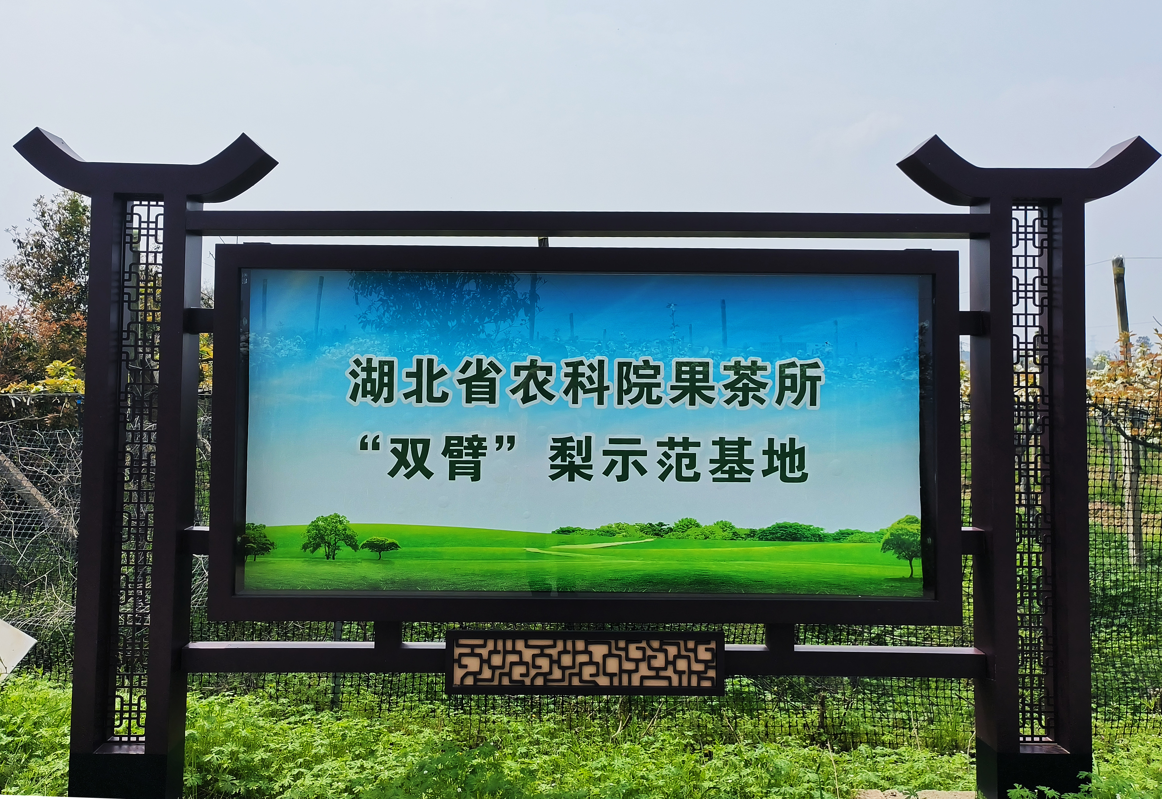 同时,梨园采用湖北省农科院推广的“双臂顺行式”平棚技术,将梨树修剪成“Y”字形双臂沿网架伸展,让每一朵花、每一颗果都能均匀受光,保障果实口感与品质。目前,这里已是湖北省农科院果茶所“双臂梨”示范基地,成为现代生态梨园的样板。