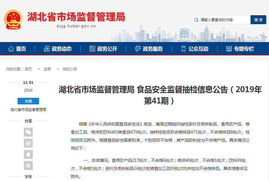 中国食品安全网讯(记者 胡毅) 11月1日,湖北省市场监督管理局发布第41期食品安全监督抽检信息公告。该局近期组织抽检茶叶及相关制品、食用农产品、粮食加工品、糕点和饮料共5类食品479批次。抽样检验项目合格样品471批次,不合格样品8批次。其中,武汉中商超市连锁有限公司中南店销售的才鱼(黑鱼)以及武汉武商超市管理有限公司津泰店销售的泥鳅检出氧氟沙星超标。