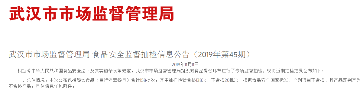 中国食品安全网讯(记者 胡毅) 记者15日了解到,近日,武汉市市场监督管理局发布《食品安全监督抽检信息公告(2019年第45期)》。公告显示,武汉市市场监督管理局组织对食品餐饮环节进行了专项监督抽检。本次公布包括餐饮食品(自行消毒餐具)合计158批次。其中抽样检验合格138次,不合格20批次。根据食品安全国家标准,个别项目不合格,其产品即判定为不合格产品。
