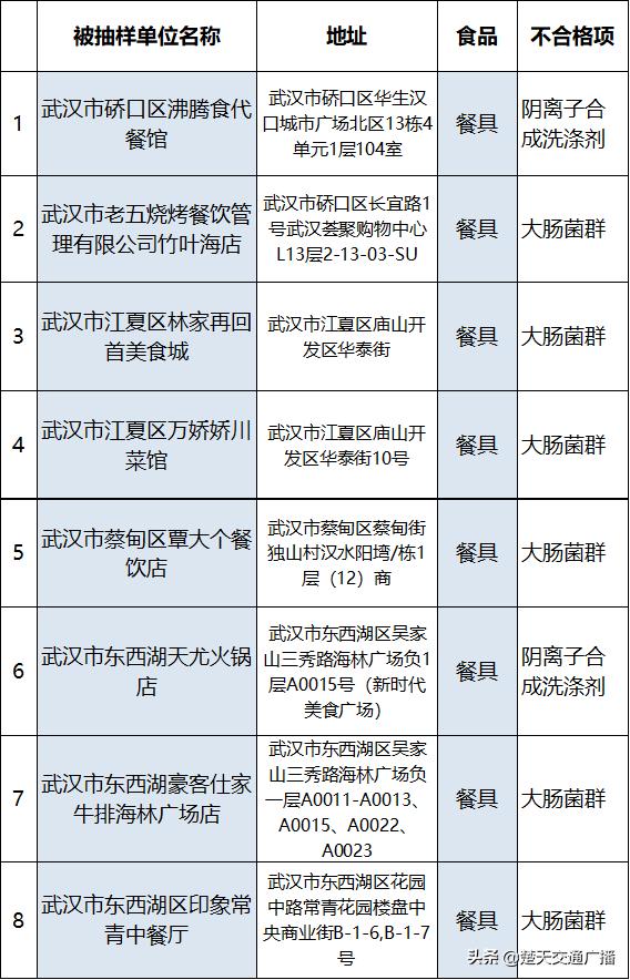 本次主要抽检了武汉市内多个餐饮单位的餐饮具,合计158批次,抽检项目包括大肠菌群、游离性余氯、阴离子合成洗涤剂等指标。共检出不合格餐具12批次,涉及印象常青中餐厅等8家餐厅。