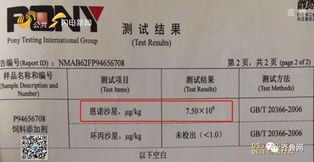 威海荣成市桃源种禽有限公司负责人刘玉龙介绍,在这款饲料添加剂的外包装原料组成中并没有恩诺沙星。可是,他们经过第三方检验鉴定报告却显示,其中含有7.5×10^6(10的6次方)微克的恩诺沙星。