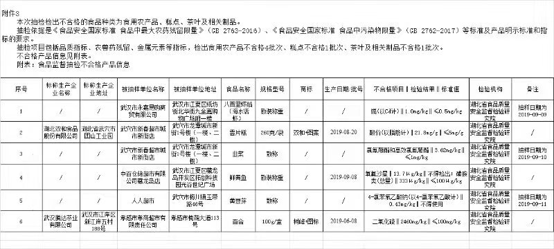 中国食品安全网讯(记者 胡毅)近日,湖北省市场监督管理局发布《湖北省市场监督管理局食品安全监督抽检信息公告(2019年第44期)》。公告显示,湖北省市场监管局近期组织抽检食用农产品、粮食加工品、饮料、糕点、茶叶及相关制品、饼干、蛋制品、食盐、保健食品共9类食品323批次。其中抽样检验项目合格样品317批次,不合格样品6批次。