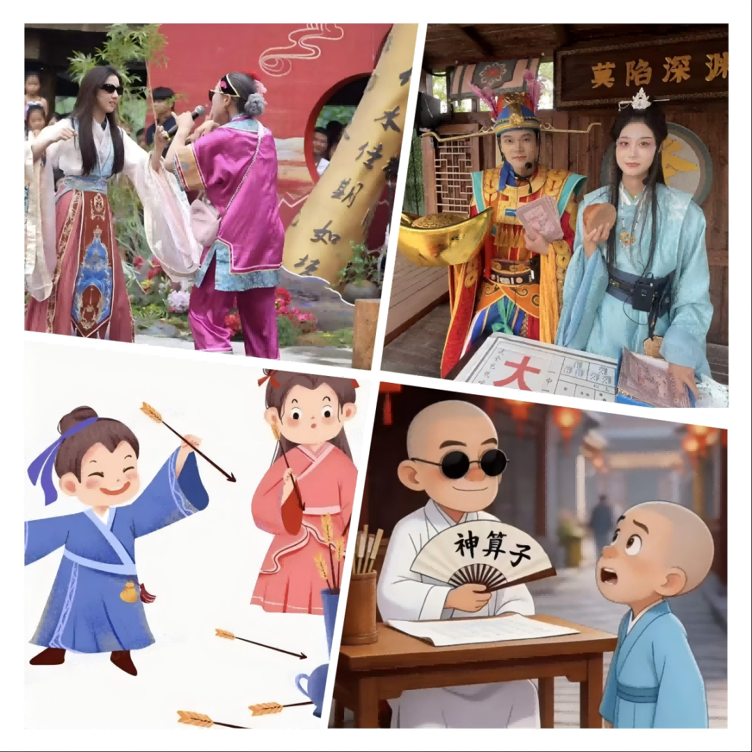 除了欢乐游戏,景区还打造了沉浸式益智互动场景,将文化体验与趣味玩乐完美融合。花仙子赌坊NPC互动、诗仙李白对诗、孟浩然猜谜、神算子测运势等项目轮番登场,还有爱心丘比特射箭、欢乐投壶、踢毽子、花婆婆斗舞等活动,游客参与即可赢取园区专属银票,寓教于乐,让孩子在玩乐中感受传统文化魅力,实现玩中学、学中乐。
